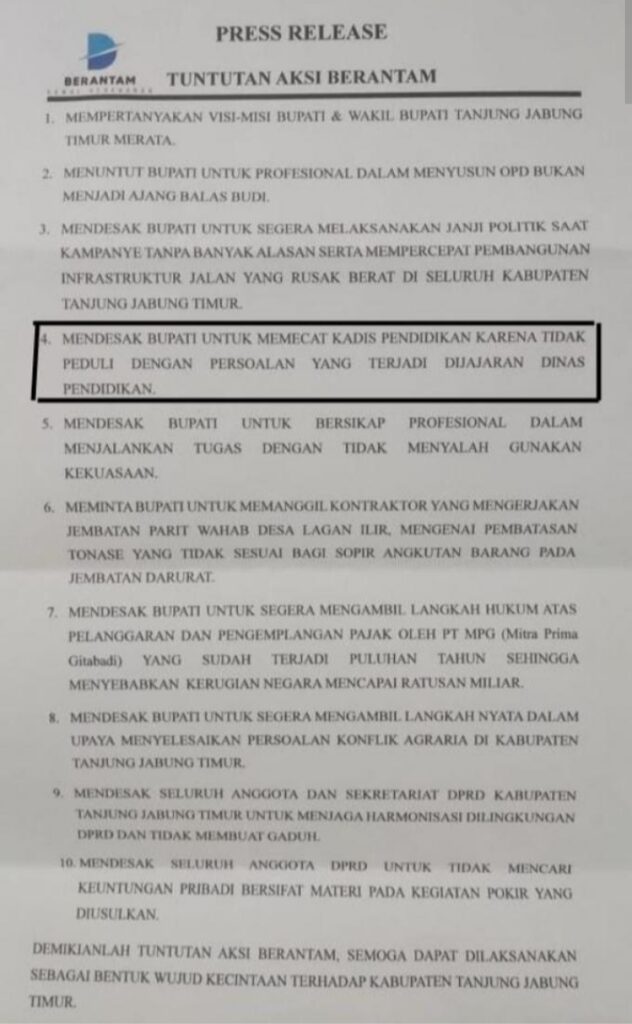 Infobrita.com|Tanjab Timur- Aksi penyampaian desakan pemecatan Kepala Dinas Pendidikan Kabupaten Tanjung Jabung Timur (Tanjabtim) Syafaruddin, terkesan sepihak dan dapat dianggap sebagai upaya pemaksaan kehendak, berujung menarik perhatian dan menimbulkan pertanyaan tentang motif di balik aksi desakan pemecatan tersebut.