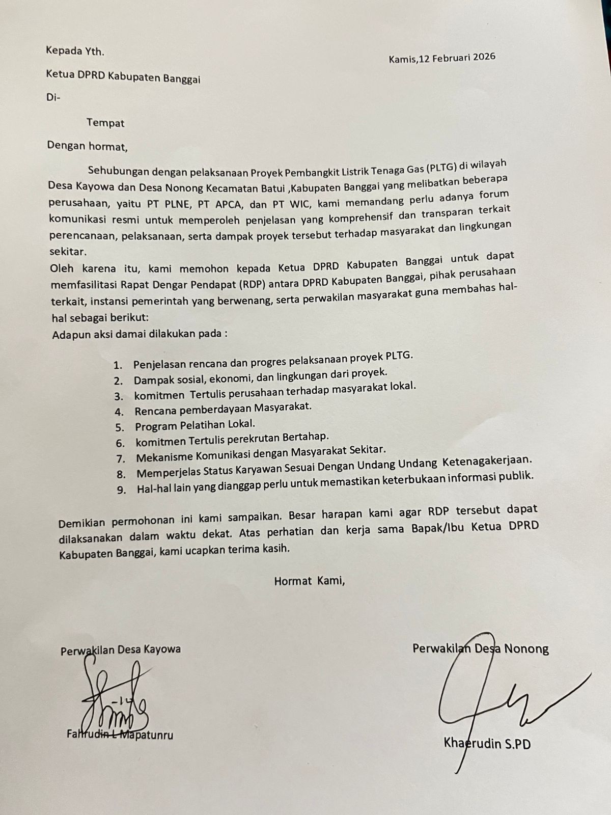 Infobrita.com|Banggai – Masyarakat Desa Kayowa dan Desa Nonong, Kecamatan Batui, Kabupaten Banggai, secara resmi telah menyurati Ketua DPRD Kabupaten Banggai pada Kamis, 12 Februari 2026. Surat tersebut berisi permohonan agar DPRD segera memfasilitasi Rapat Dengar Pendapat (RDP) terkait pelaksanaan Proyek Pembangkit Listrik Tenaga Gas (PLTG) yang berada di wilayah kedua desa tersebut.