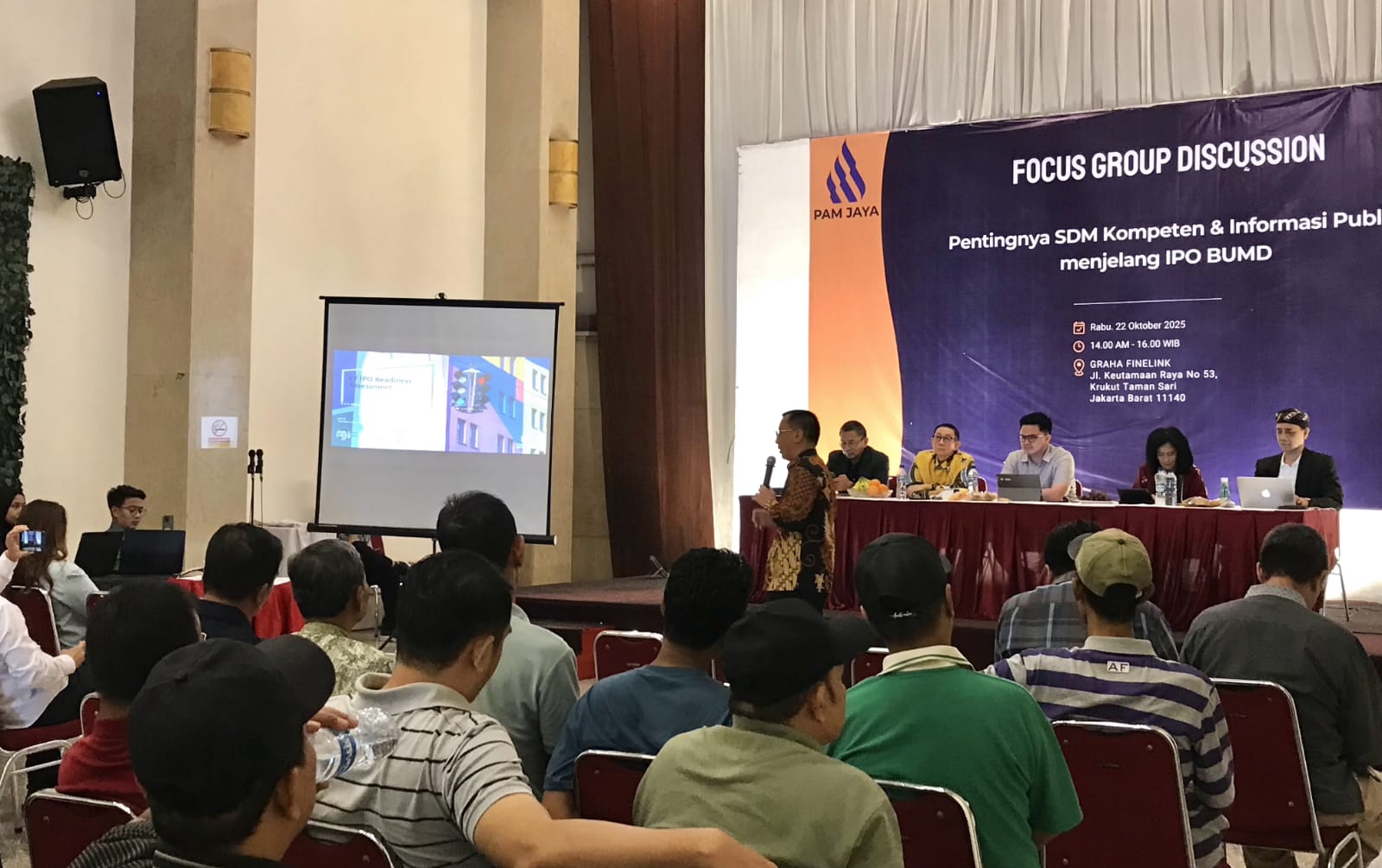 Kegiatan ini menjadi bagian dari strategi transformasi PAM Jaya menuju BUMD modern dan berstandar global. FGD menghadirkan narasumber dari berbagai bidang strategis, yaitu Gatra Vaganza (GM PAM Jaya), Jongki D. Widjaja, SE., Ak., M.Ak. (PT Ernst & Young Indonesia), Maria Ellen Fransisca Y. (Asosiasi Data Analitik), Totok Sediyantoro, MBA, Ph.D. (Ketua LSP SDMTIK), dan Heintje Grontson Mandagie (Ketua Serikat Pers Republik Indonesia).