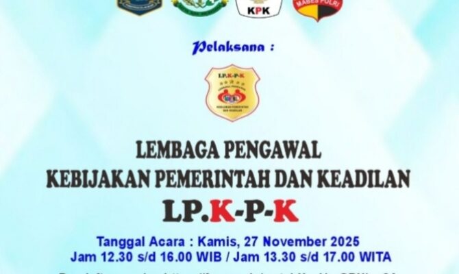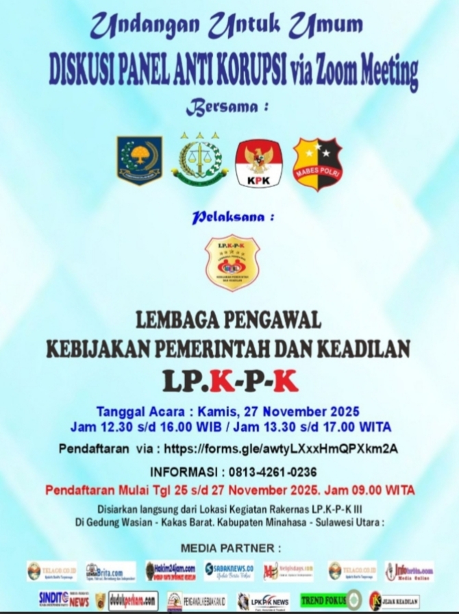 Infobrita.com|Minahasa- 25 November 2025 — Dalam rangka mendukung penguatan gerakan antikorupsi di Indonesia, Lembaga Pengawal Kebijakan Pemerintah dan Keadilan (LPKPK) mengundang masyarakat luas untuk mengikuti Diskusi Panel Anti Korupsi yang akan dilaksanakan secara daring melalui Zoom Meeting pada Kamis, 27 November 2025.